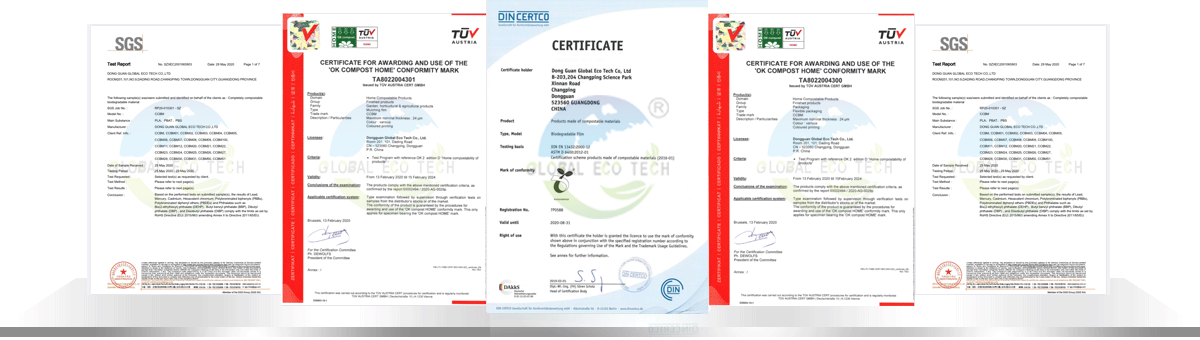 東莞全球環保科技有限公司總部位于東莞東部地區、公司致力于全生物降解材料和全生物降解秸稈復合材料的生產研發,專業提供全生物降解 CCBM系列材科,PBAT、PBS、PLA樹脂及全生物降解膜袋、筒膜、餐具覆膜、阻隔膜、復合包裝膜、衛生巾膜等產品。給塑料制造商和消費者提供一站式全品類的解決方案和技術支援。產品已通過德國DIN CERTCO、歐洲TUV公司OK compost HOME認證、國標認證GB/T19277.1-2011:符合歐盟EN13432、美國ASTMD6400、 BPI、澳洲ABA堆肥降解檢測標準,并通過SGS公司檢測的FDA食品接觸安全測試、ROHS有害物質檢測、REACH檢測。我司獲得國家高新技術企業認證、通過了GRS驗廠并且取得了GRS認證,產品熱銷于歐洲、美國、亞洲等30多個國家。